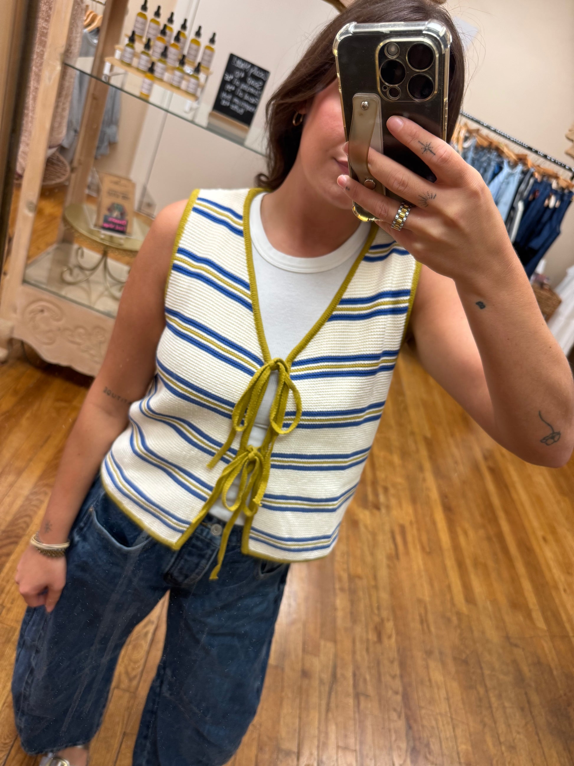 The Annie Striped Vest is a retro looking knit that can be layered over tanks or button downs! Loose fit with adjustable ties.