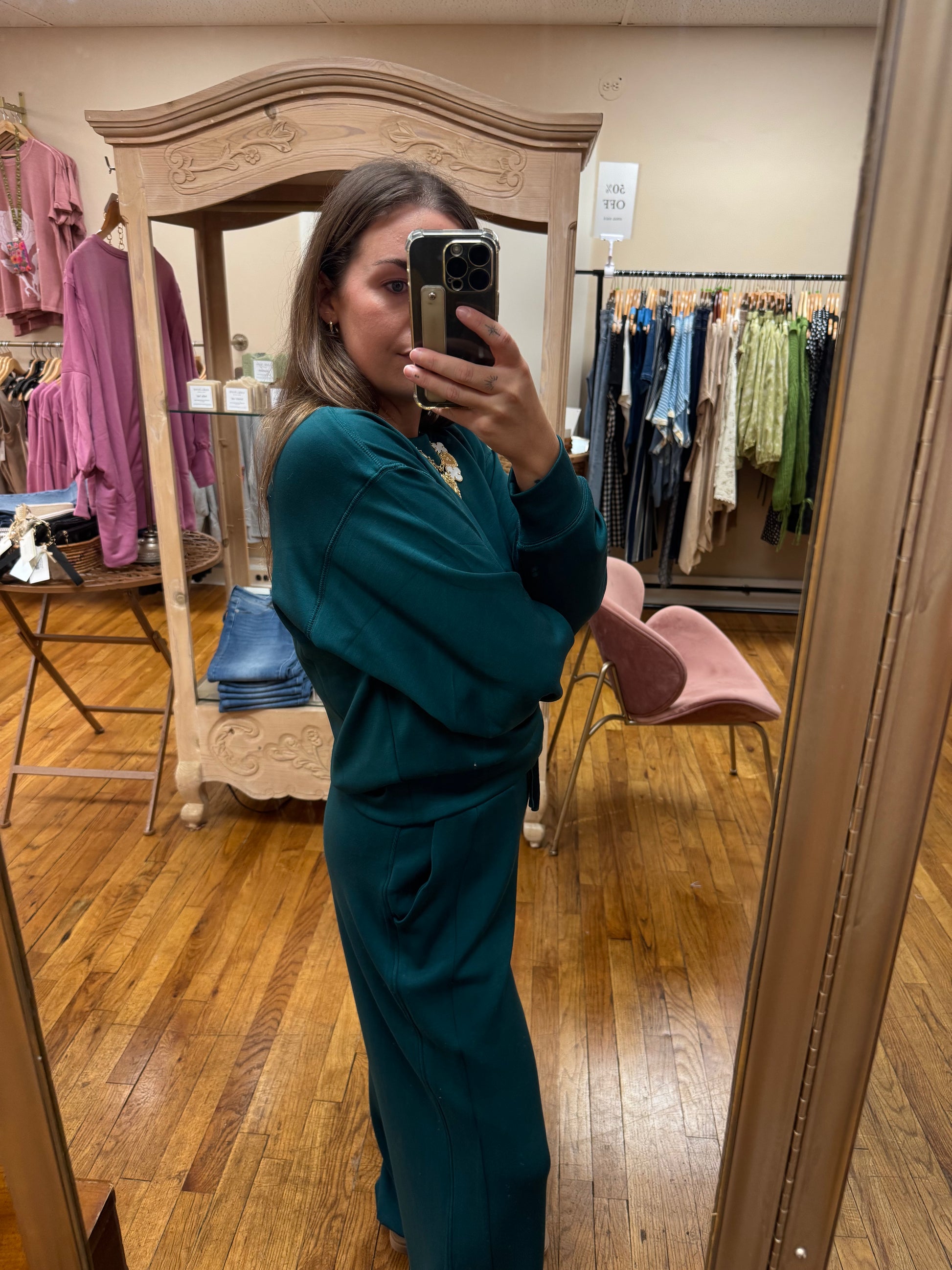 Super soft crewneck with matching pants in the perfect forest green for fall!