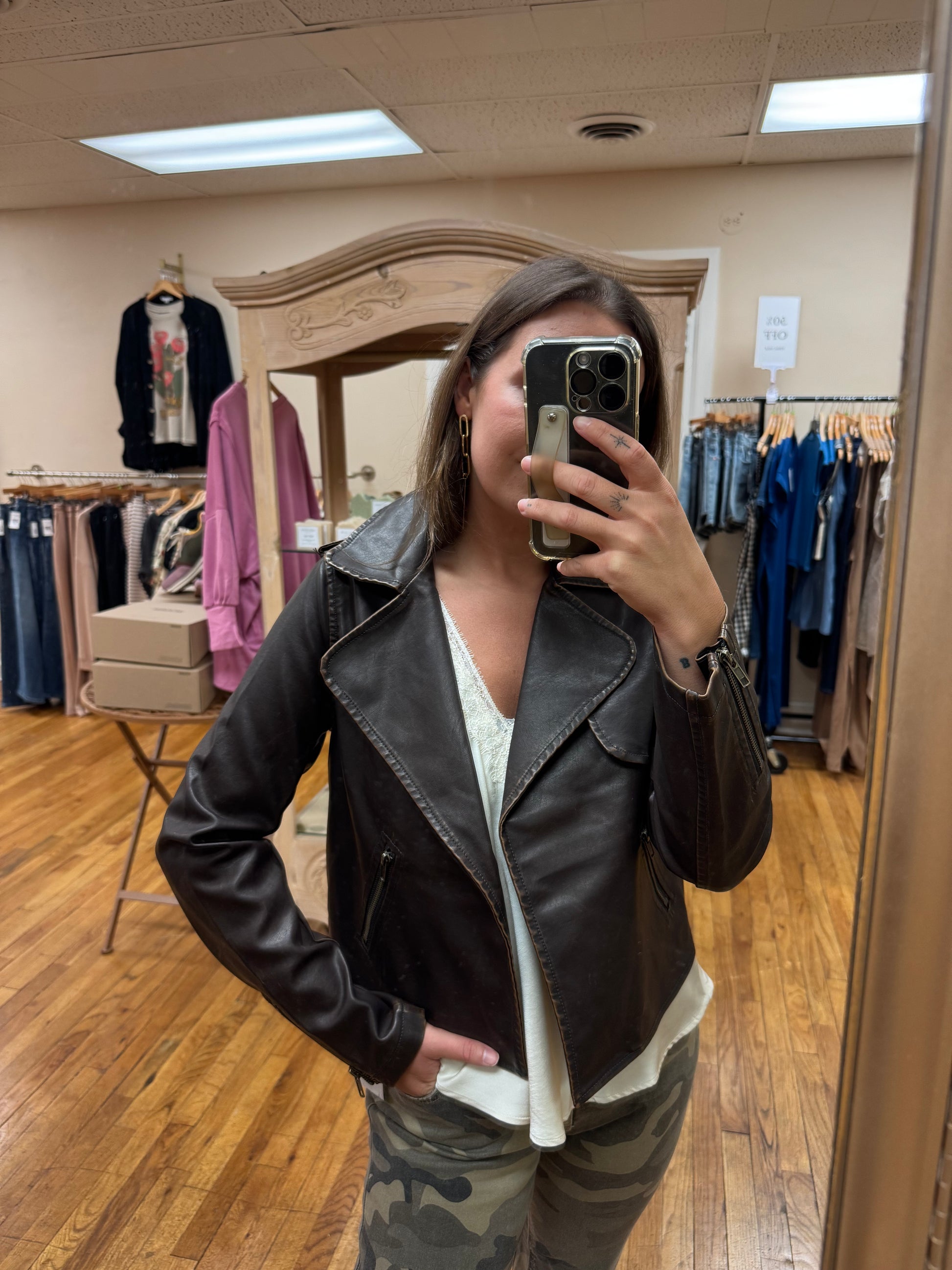 Add a little edge to your wardrobe with the Espresso Moto Jacket! It’s perfectly cropped and fits true to size.