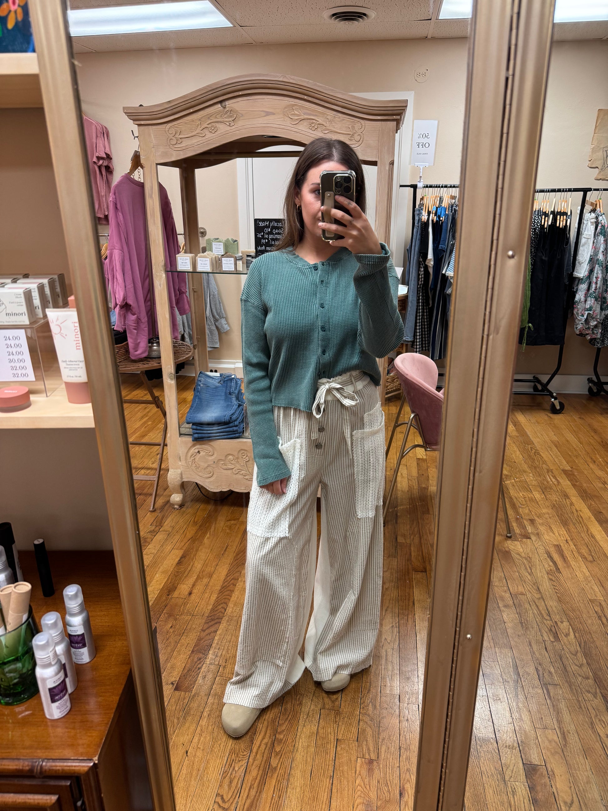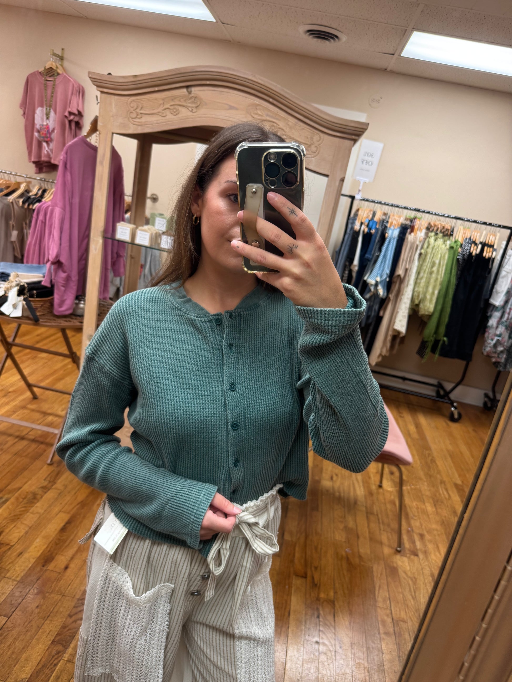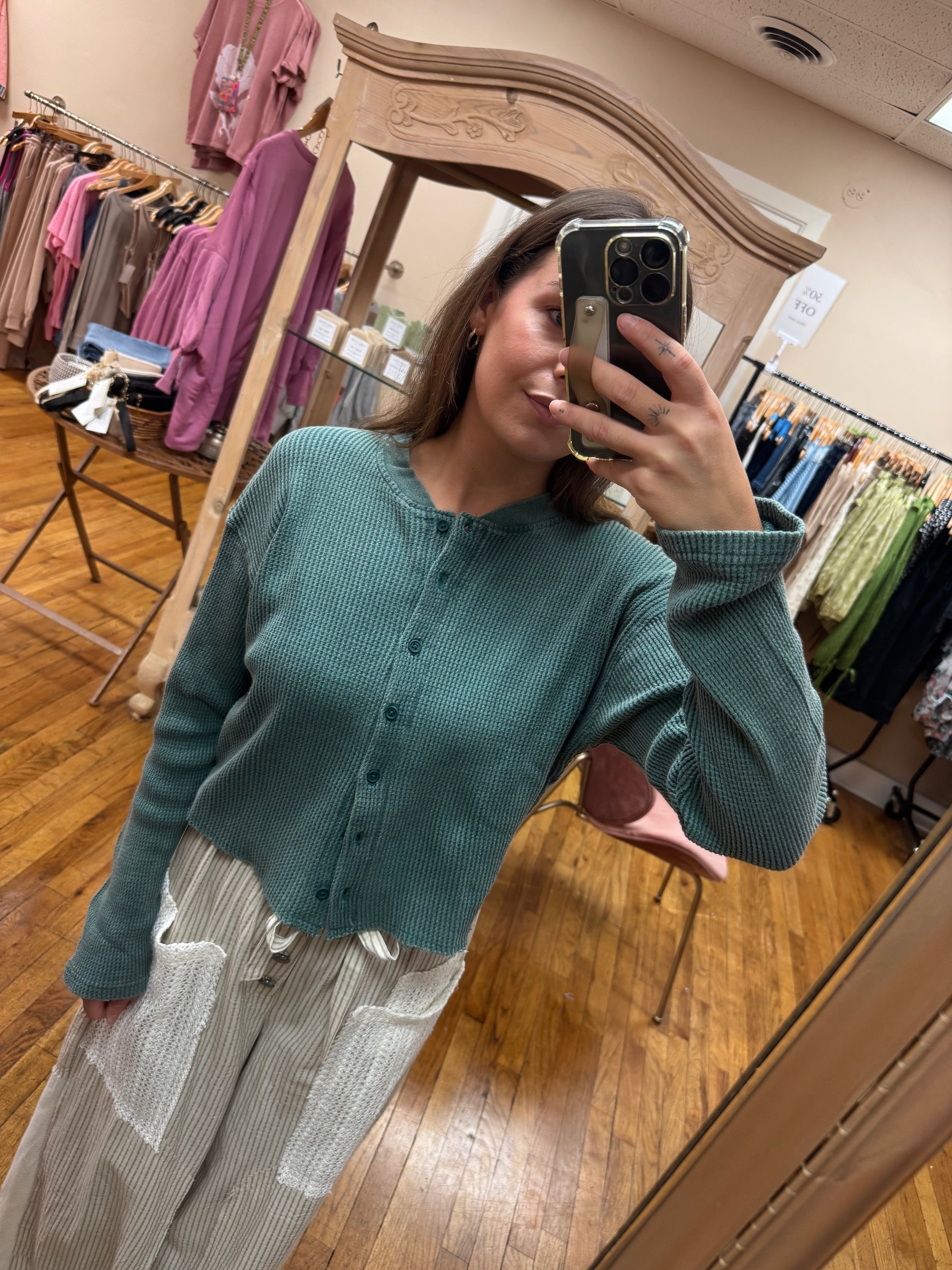 This cozy, 100% cotton waffle knit button down has the perfect cropped fit with a slightly flared sleeve. Wear it as a top or unbuttoned as a cardigan.
